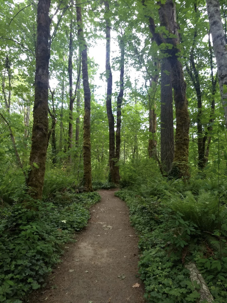 Upon reentering the park you are immediately plunged into forest. Big leaf maples dominate, with other native species mixed in. The understory includes salmonberry, thimbleberry, osoberry, bleeding heart, and ferns. Listen for Warbling Vireo, Pacific-slope Flycatcher, and Swainson’s Thrush. Barred owls are occasionally seen along the trail. This corridor is lined with fruit-bearing shrubs and trees, and is a good spot to find fruit-eating birds year round. This year there appears to be a bumper crop of Indian Plum (osoberry), which the waxwings, robins and Swainson’s Thrush are enjoying. Soon you will arrive at the Fir St. entrance. Go left to continue inside the park.