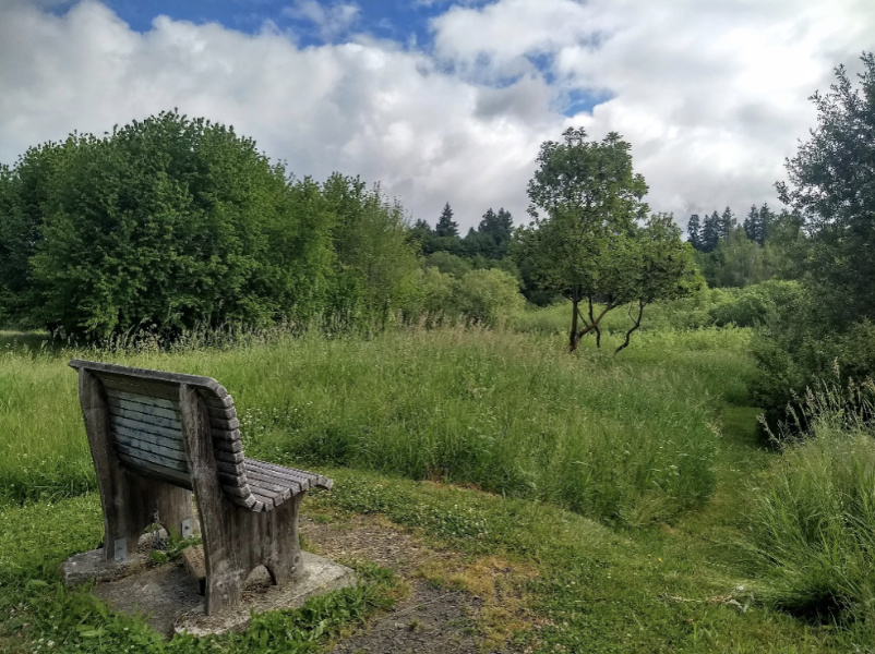 To the right of the hillside bench, take the trail down the hill toward the wetland. This is a great place to scan the area. To the right the trail will take you to the McCormick St. entrance. Exit the park here and continue on McCormick St. Go left on Pine St. and continue. Where the road dips down Mission Creek crosses beneath. Stop here to scan the wetlands on both sides of the road. This is a great area for warblers, kinglets, woodpeckers and waxwings. Next go left on Edison St. NE. On the right you will pass a llama farm and Buddhist temple, great properties to scan for birds. Reenter the park at the Edison St. entrance.